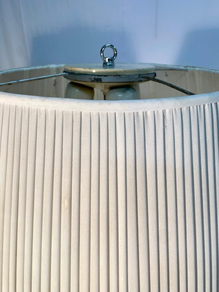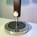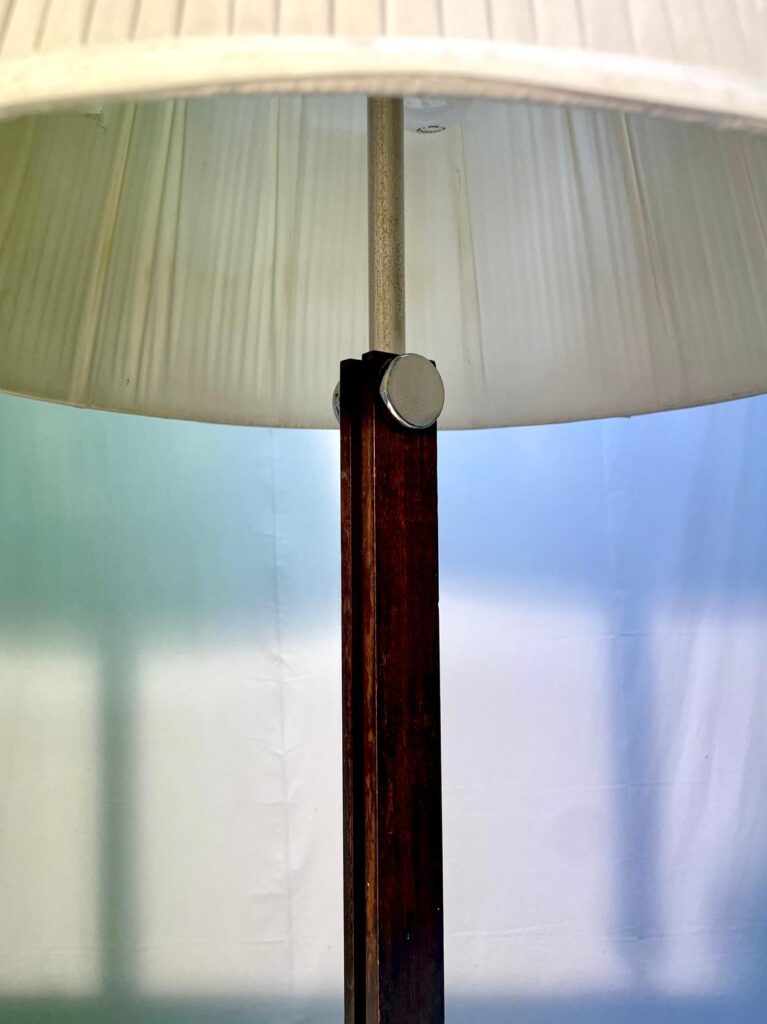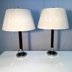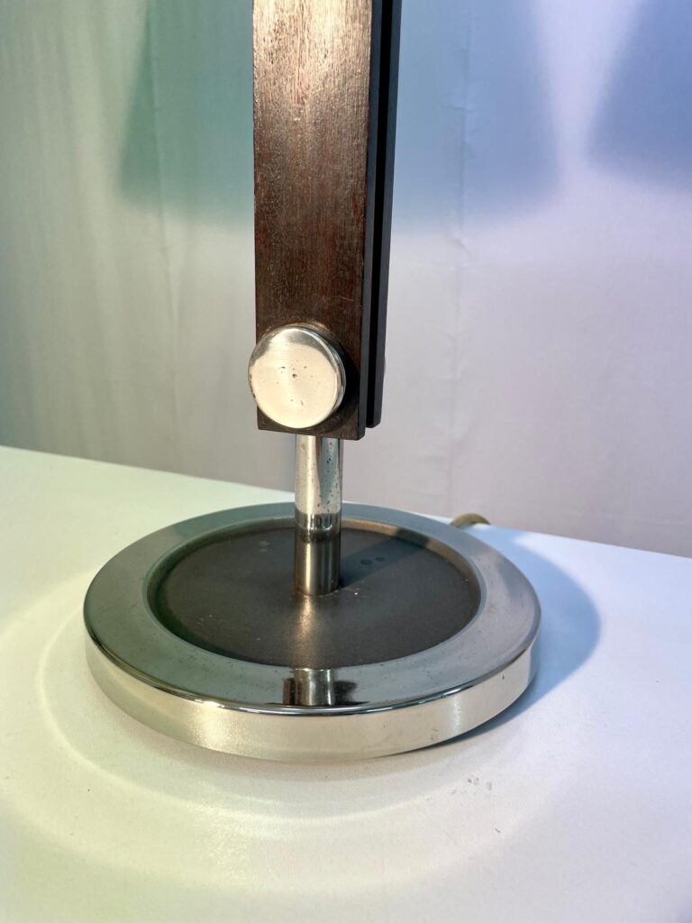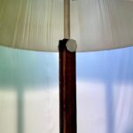 DESCRIZIONE : coppia di lampade anni ’60, con base in metallo, gambo in legno con finiture tonde in metallo e paralume originale in tessuto. Produzione Ilum.